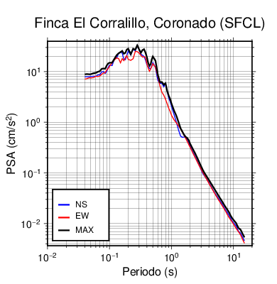 En los siguientes gráficos, la traza verde es el espectro propuesto por el CSCR-2010, la traza negra es el espectro máximo de este sismo. El valor de la amplitud está dado en pseudoaceleración en cm/s2.