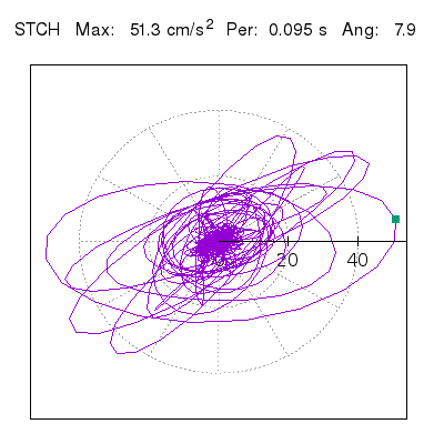 Tomando el periodo en el cual se presenta la amplitud máxima del espectro de respuesta máxima para cada estación, se representa la respuesta bidireccional en función del tiempo sobre el plano horizontal. Se identifica el punto (color verde en cada figura) del cual se desprende la orientación mostrada en el mapa de la sección superior. El valor de la acelereración máxima corresponde al punto del espectro de respuesta para el periodo indicado.