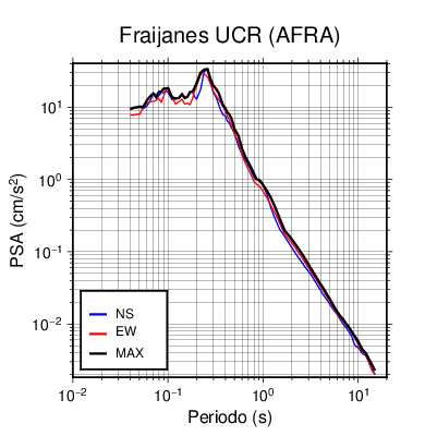 En los siguientes gráficos, la traza verde es el espectro propuesto por el CSCR-2010, la traza negra es el espectro máximo de este sismo. El valor de la amplitud está dado en pseudoaceleración en cm/s2.