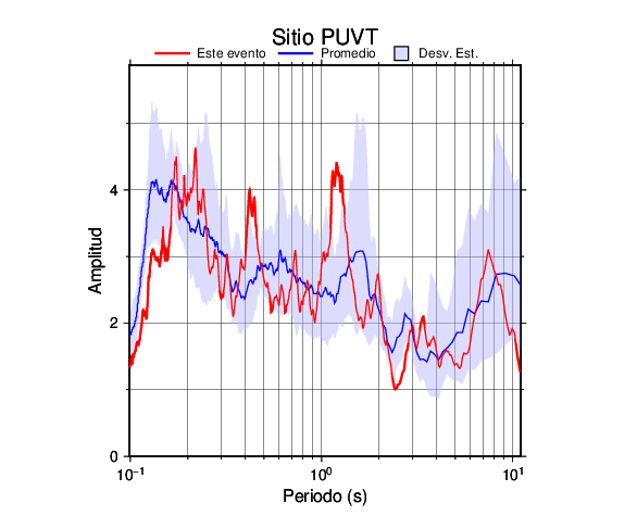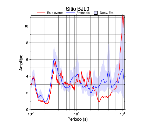 Los resultados que se presentan aquí fueron obtenidos luego de dividir las componentes horizontales entre la componente vertical (conocido como técnica H/V). Se grafica tanto el efecto de sitio del sismo registrado como el valor promedio en cada estación y su correspondiente desviación estándar.