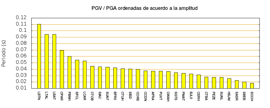 El cociente de la velocidad máxima (PGV) entre la aceleración máxima (PGA) brinda información de los periodos más significativos del movimiento del suelo. En el gráfico siguiente se muestran las estaciones ordenadas por su cercanía al epicentro. La más cercana está a la izquierda y la más lejana a la derecha. También se muestran los mismos datos en orden alfabético y ordenados de mayor a menor amplitud.