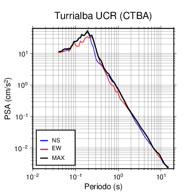 En los siguientes gráficos, la traza verde es el espectro propuesto por el CSCR-2010, la traza negra es el espectro máximo de este sismo. El valor de la amplitud está dado en pseudoaceleración en cm/s2.