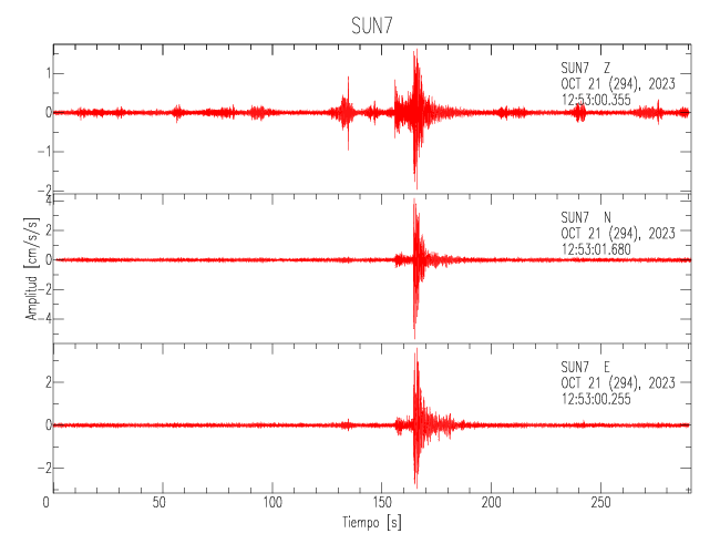 La siguiente tabla muestra los datos de aceleración máxima para cada componente en porcentaje de la aceleración de la gravedad (%g). Estos se obtienen dividiendo el valor del PGA registrado por 980 cm/s2 y multiplicándolo por 100. Los valores de las últimas dos columnas corresponden a la componente radial y transversal. Los datos se listan en orden descendente según el valor de la componente radial.