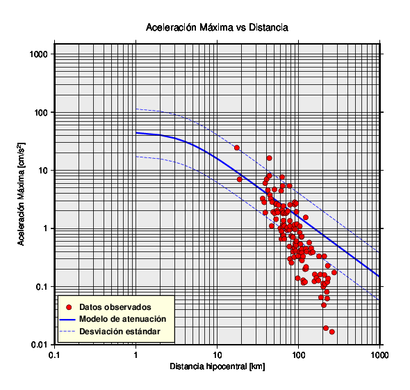 Datos del valor de la aceleración máxima (PGA por sus siglas en inglés) de cada estación (puntos rojos) en función de la distancia al hipocentro. Las trazas azules corresponden al modelo de atenuación y su respectiva desviación estándar.