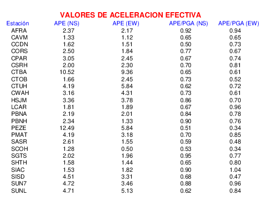 La siguiente tabla muestra los valores de aceleración efectiva para las componentes norte-sur (NS) y este-oeste (EW). También se muestra el valor del cociente entre la aceleración efectiva y la aceleración máxima (APE/PGA).