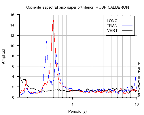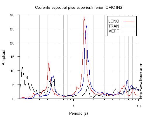 También se muestra el cociente espectral (en el rango de 0.1 a 10 s) entre el nivel superior (sea el último piso o la azotea) e inferior (sea el primero piso o el sótano) para cada una de las componentes LONG=longitudinal, TRAN=transversal y VERT=vertical. En los casos en que el nivel superior o inferior no estén disponibles al momento del sismo, se muestra una imagen con la leyenda "No se pudo calcular".