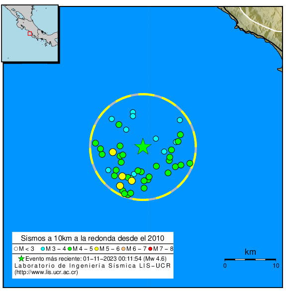 A 10km a la redonda del epicentro, el LISUCR ha localizado también los siguientes sismos ocurridos desde el 2010. Todos ellos con profundidades inferiores a los 40km.