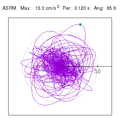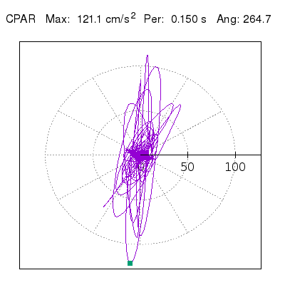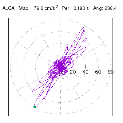 Tomando el periodo en el cual se presenta la amplitud máxima del espectro de respuesta máxima para cada estación, se representa la respuesta bidireccional en función del tiempo sobre el plano horizontal. Se identifica el punto (color verde en cada figura) del cual se desprende la orientación mostrada en el mapa de la sección superior. El valor de la acelereración máxima corresponde al punto del espectro de respuesta para el periodo indicado.