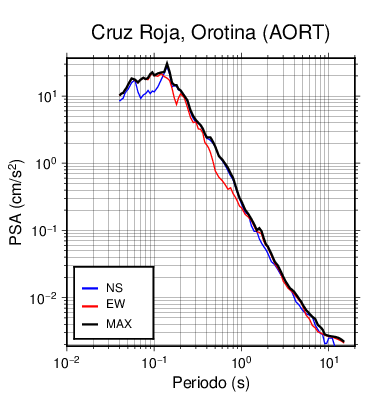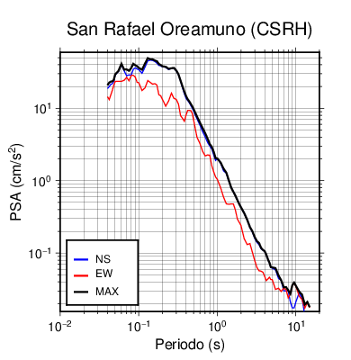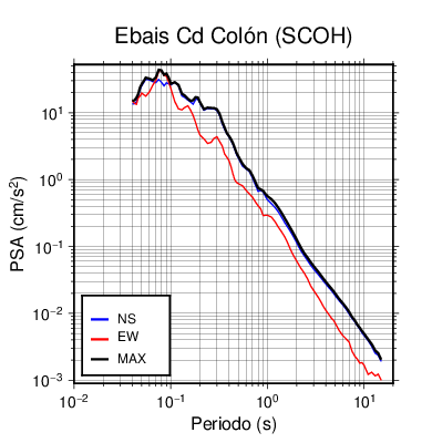 En los siguientes gráficos, la traza verde es el espectro propuesto por el CSCR-2010, la traza negra es el espectro máximo de este sismo. El valor de la amplitud está dado en pseudoaceleración en cm/s2.