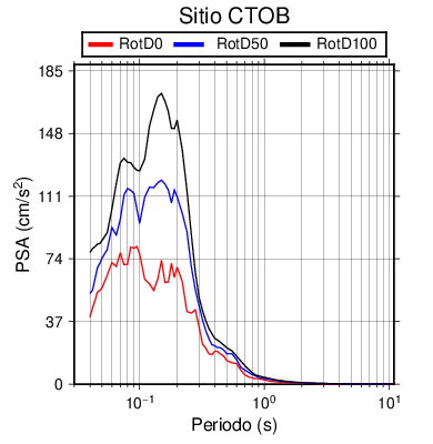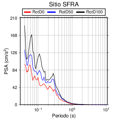 RotD50 representa un valor medio de la respuesta por lo cual se puede comparar con valores de otras medidas empleadas en modelos de atenuación como la Media Geométrica de las componentes ortogonales (GM). RotD0 y RotD100 son los valores extremos (mínimo y máximo), los cuales nos pueden servir para determinar la dispersión de la posible respuesta en cada sitio.