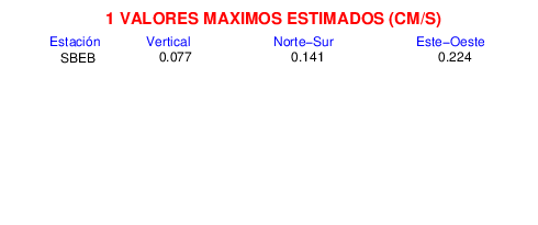 Los registros de velocidad se obtienen de la integración de los datos de aceleración. Esta tabla contiene los valores de velocidad máxima (PGV por sus siglas en inglés) para cada componente en cm/s. Las estaciones se listan en orden alfabético y corresponden a los sitios en que el nivel de aceleración fue superior a los 5 cm/s2.