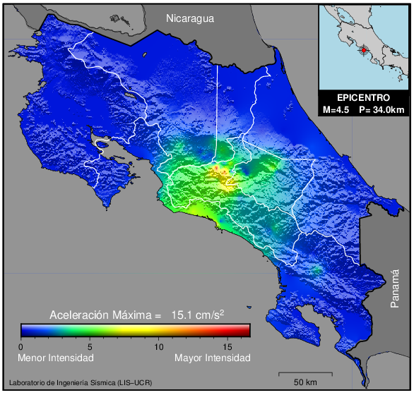 Los datos de aceleración máxima registrada se interpolan para obtener un mapa de isoaceleraciones. En el se puede ver la tendencia general de la amplificación de todo el país a partir del lugar en que el movimiento fue más intenso.