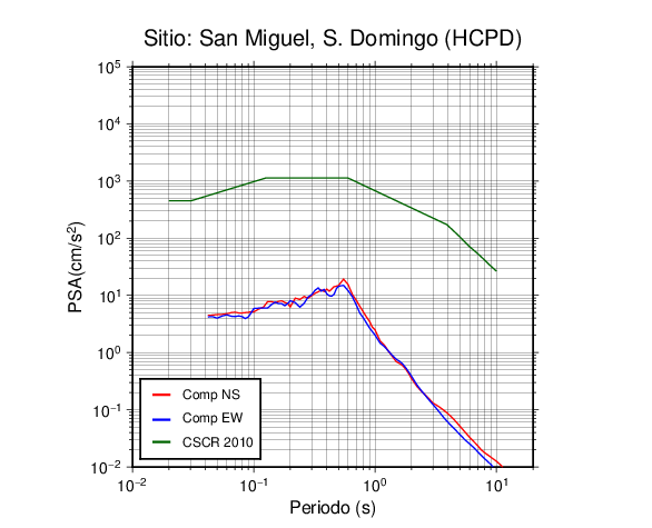 En los siguientes gráficos, la traza verde es el espectro propuesto por el CSCR-2010, la traza roja es el espectro de este sismo en la componente norte-sur (NS) y la traza azul la componente este-oeste (EW). El valor de la amplitud está dado en pseudoaceleración en cm/s2.