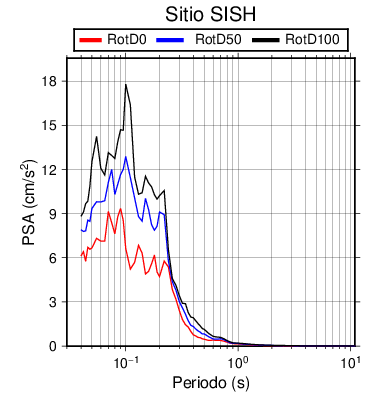 RotD50 representa un valor medio de la respuesta por lo cual se puede comparar con valores de otras medidas empleadas en modelos de atenuación como la Media Geométrica de las componentes ortogonales (GM). RotD0 y RotD100 son los valores extremos (mínimo y máximo), los cuales nos pueden servir para determinar la dispersión de la posible respuesta en cada sitio.