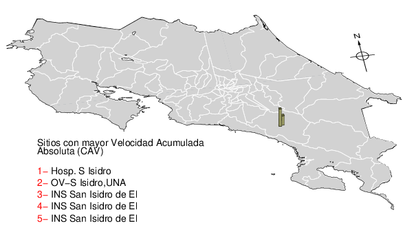 La velocidad acumulada absoluta (CAV por sus siglas en inglés) es otro parámetro que se usa para caracterizar el movimiento fuerte del suelo. Los datos están dados en cm/s para las componentes norte-sur (NS) y este-oeste (EW). El máximo de ambas se da en la tercera columna.
