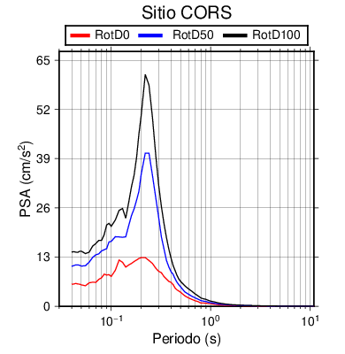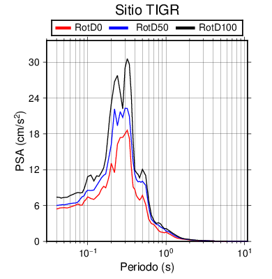 RotD50 representa un valor medio de la respuesta por lo cual se puede comparar con valores de otras medidas empleadas en modelos de atenuación como la Media Geométrica de las componentes ortogonales (GM). RotD0 y RotD100 son los valores extremos (mínimo y máximo), los cuales nos pueden servir para determinar la dispersión de la posible respuesta en cada sitio.