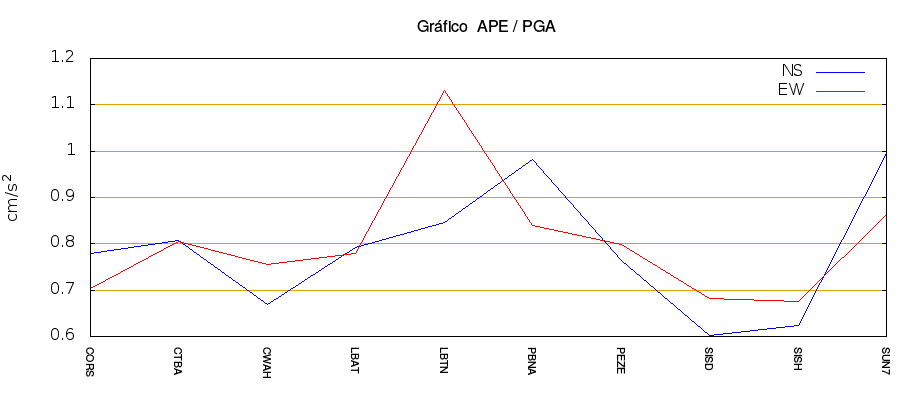 La siguiente tabla muestra los valores de aceleración efectiva para las componentes norte-sur (NS) y este-oeste (EW). También se muestra el valor del cociente entre la aceleración efectiva y la aceleración máxima (APE/PGA).