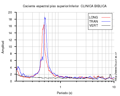 También se muestra el cociente espectral (en el rango de 0.1 a 10 s) entre el nivel superior (sea el último piso o la azotea) e inferior (sea el primero piso o el sótano) para cada una de las componentes LONG=longitudinal, TRAN=transversal y VERT=vertical. En los casos en que el nivel superior o inferior no estén disponibles al momento del sismo, se muestra una imagen con la leyenda "No se pudo calcular".