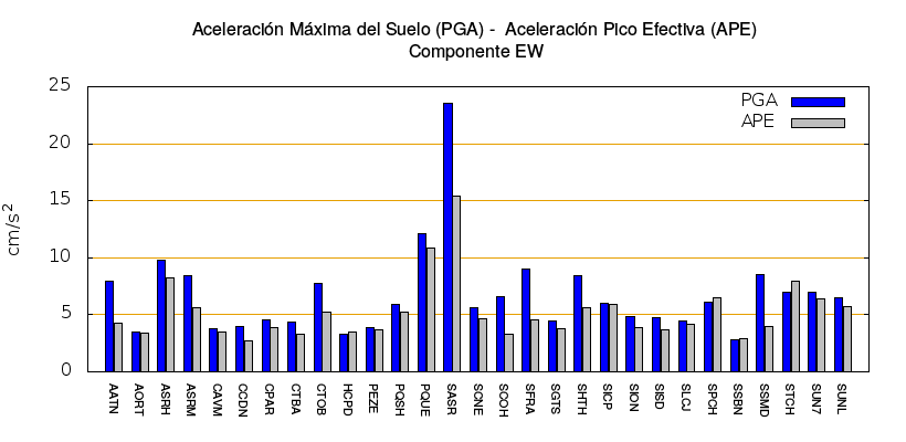 La siguiente tabla muestra los valores de aceleración efectiva para las componentes norte-sur (NS) y este-oeste (EW). También se muestra el valor del cociente entre la aceleración efectiva y la aceleración máxima (APE/PGA).