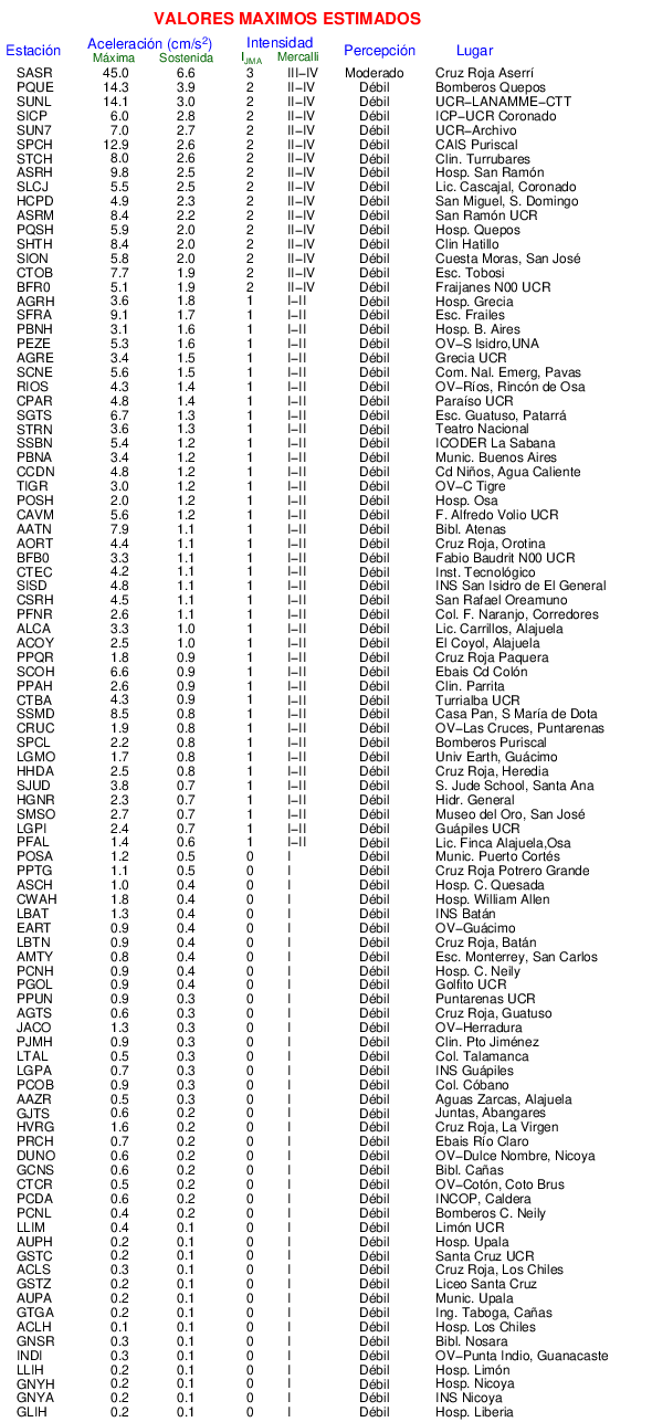 La siguiente tabla muestra los valores de Aceleración Máxima o aceleración pico (PGA por sus siglas en inglés). Este es el valor máximo en cualquiera de las 3 componentes del registro.