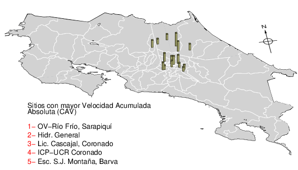 La velocidad acumulada absoluta (CAV por sus siglas en inglés) es otro parámetro que se usa para caracterizar el movimiento fuerte del suelo. Los datos están dados en cm/s para las componentes norte-sur (NS) y este-oeste (EW). El máximo de ambas se da en la tercera columna.