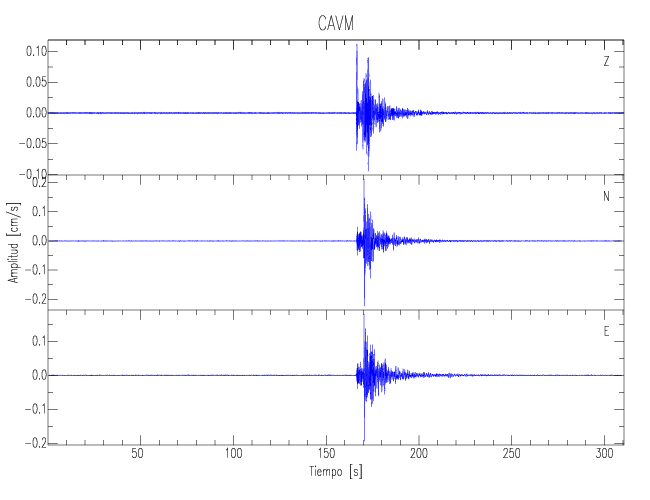 Los registros de velocidad se obtienen de la integración de los datos de aceleración. Esta tabla contiene los valores de velocidad máxima (PGV por sus siglas en inglés) para cada componente en cm/s. Las estaciones se listan en orden alfabético y corresponden a los sitios en que el nivel de aceleración fue superior a los 5 cm/s2.