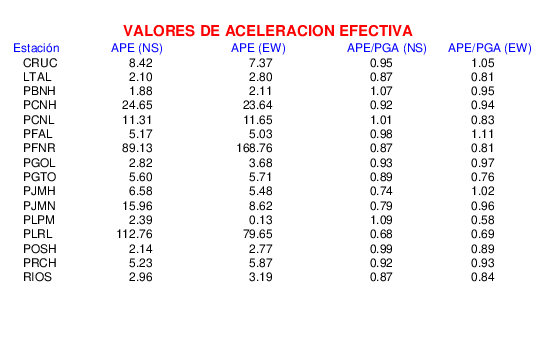 La siguiente tabla muestra los valores de aceleración efectiva para las componentes norte-sur (NS) y este-oeste (EW). También se muestra el valor del cociente entre la aceleración efectiva y la aceleración máxima (APE/PGA).