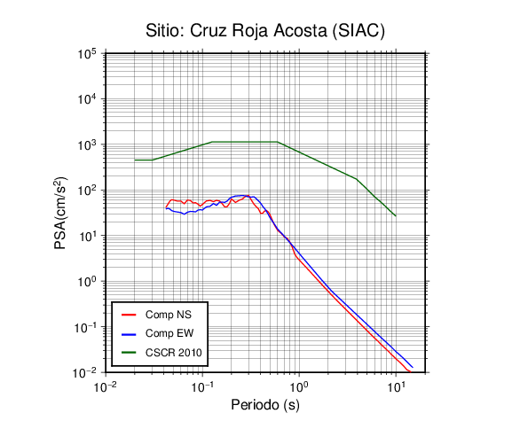 En los siguientes gráficos, la traza verde es el espectro propuesto por el CSCR-2010, la traza roja es el espectro de este sismo en la componente norte-sur (NS) y la traza azul la componente este-oeste (EW). El valor de la amplitud está dado en pseudoaceleración en cm/s2.