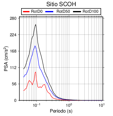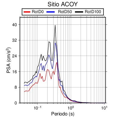 RotD50 representa un valor medio de la respuesta por lo cual se puede comparar con valores de otras medidas empleadas en modelos de atenuación como la Media Geométrica de las componentes ortogonales (GM). RotD0 y RotD100 son los valores extremos (mínimo y máximo), los cuales nos pueden servir para determinar la dispersión de la posible respuesta en cada sitio.