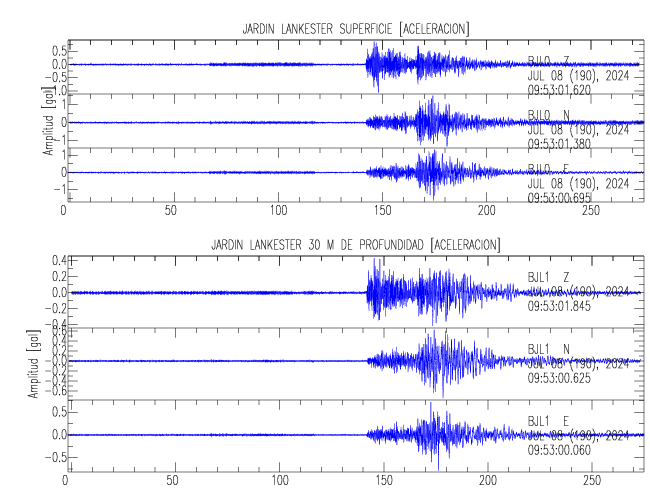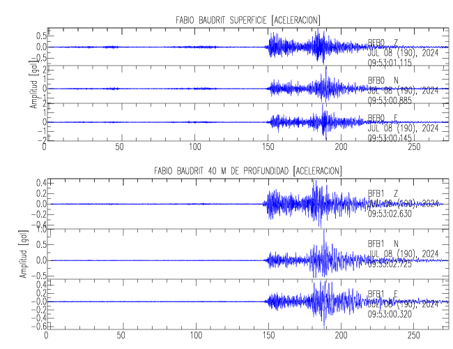 Aquí se muestran las formas de onda y cocientes espectrales de los sensores colocados en pozo . Uno se ubica en el Jardín Lankester en Paraíso de Cartago con 30 m de profundidad y el otro en la Estación Experimental Fabio Baudrit en Alajuela con 40 m de profundidad. La tabla muestra los valores de aceleración máxima (PGA) leídos de las tres componentes en superficie (N00) y en profundidad (N01)