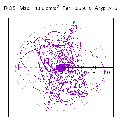 Tomando el periodo en el cual se presenta la amplitud máxima del espectro de respuesta máxima para cada estación, se representa la respuesta bidireccional en función del tiempo sobre el plano horizontal. Se identifica el punto (color verde en cada figura) del cual se desprende la orientación mostrada en el mapa de la sección superior. El valor de la acelereración máxima corresponde al punto del espectro de respuesta para el periodo indicado.
