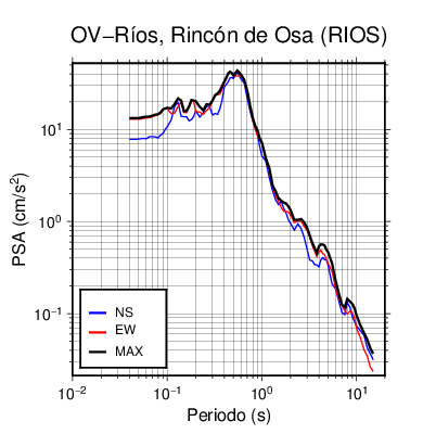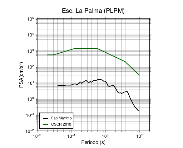 En los siguientes gráficos, la traza verde es el espectro propuesto por el CSCR-2010, la traza negra es el espectro máximo de este sismo. El valor de la amplitud está dado en pseudoaceleración en cm/s2.