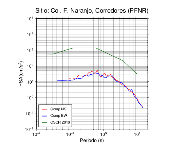 En los siguientes gráficos, la traza verde es el espectro propuesto por el CSCR-2010, la traza roja es el espectro de este sismo en la componente norte-sur (NS) y la traza azul la componente este-oeste (EW). El valor de la amplitud está dado en pseudoaceleración en cm/s2.