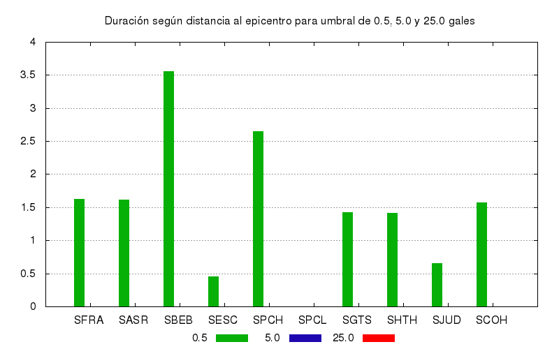 La duración para otros niveles de aceleración también se calculó. Este es el gráfico con los valores de duración para umbrales de 0.5, 5.0 y 25.0 gales. Se muestran los 10 primeros sitios ordenados por su cercanía el epicentro.