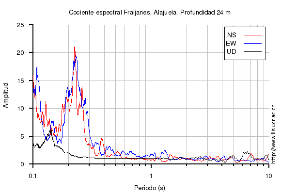 El cociente espectral se obtuvo dividiendo el espectro de amplitud de la componente en superficie con respecto a la componente en profundidad (NS=norte-sur, EW=este-oeste, UD=vertical)