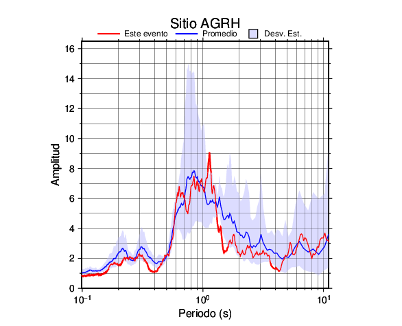 Los resultados que se presentan aquí fueron obtenidos luego de dividir las componentes horizontales entre la componente vertical (conocido como técnica H/V). Se grafica tanto el efecto de sitio del sismo registrado como el valor promedio en cada estación y su correspondiente desviación estándar.