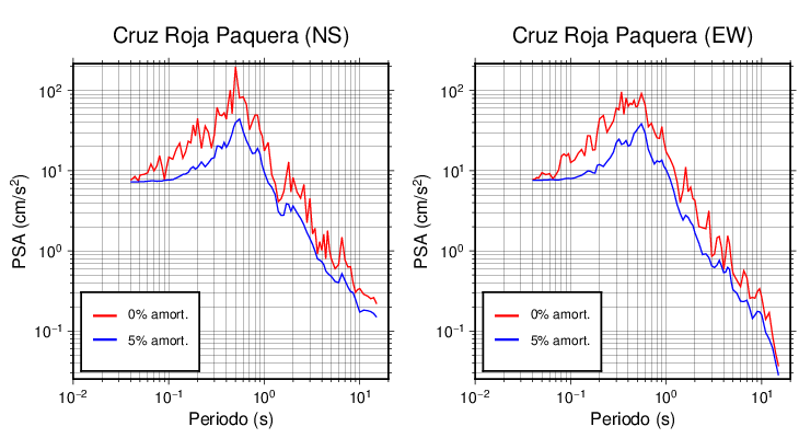 Esta tabla contiene los valores de PSA en cm/s2 calculados del espectro de respuesta con 5% de amortiguamiento a 1 segundo (se muestran los valores para aquellas estaciones que tuvieron un valor de aceleración superior a 5 cm/s2).