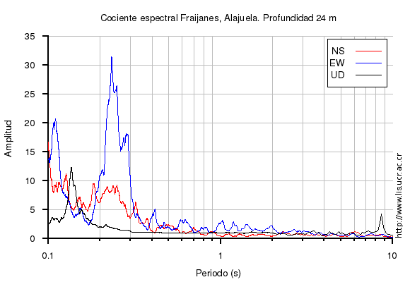 El cociente espectral se obtuvo dividiendo el espectro de amplitud de la componente en superficie con respecto a la componente en profundidad (NS=norte-sur, EW=este-oeste, UD=vertical)