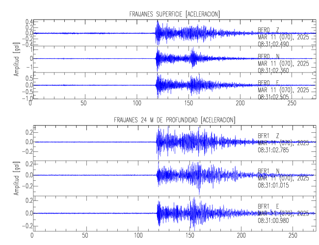 Aquí se muestran las formas de onda y cocientes espectrales de los sensores colocados en pozo . Uno se ubica en el Jardín Lankester en Paraíso de Cartago con 30 m de profundidad y el otro en la Estación Experimental Fabio Baudrit en Alajuela con 40 m de profundidad. La tabla muestra los valores de aceleración máxima (PGA) leídos de las tres componentes en superficie (N00) y en profundidad (N01)