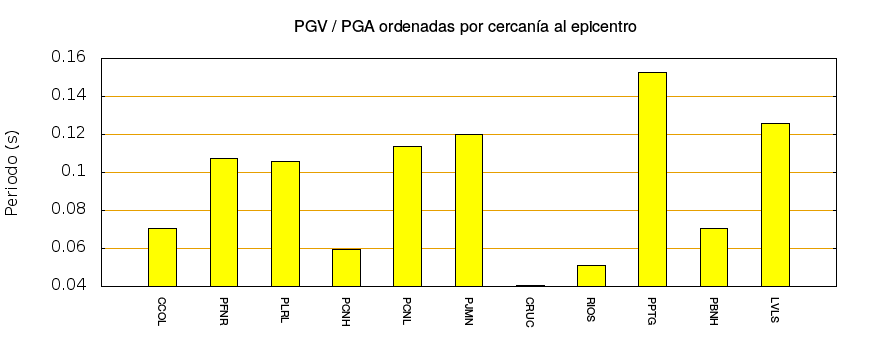 El cociente de la velocidad máxima (PGV) entre la aceleración máxima (PGA) brinda información de los periodos más significativos del movimiento del suelo. En el gráfico siguiente se muestran las estaciones ordenadas por su cercanía al epicentro. La más cercana está a la izquierda y la más lejana a la derecha. También se muestran los mismos datos en orden alfabético y ordenados de mayor a menor amplitud.
