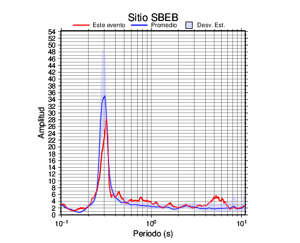 Los resultados que se presentan aquí fueron obtenidos luego de dividir las componentes horizontales entre la componente vertical (conocido como técnica H/V). Se grafica tanto el efecto de sitio del sismo registrado como el valor promedio en cada estación y su correspondiente desviación estándar.