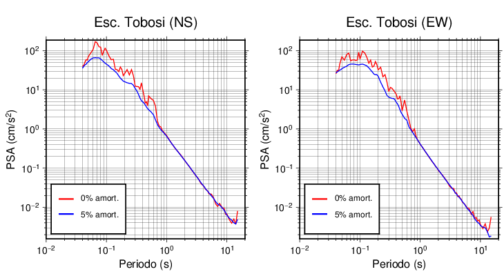 Esta tabla contiene los valores de PSA en cm/s2 calculados del espectro de respuesta con 5% de amortiguamiento a 1 segundo (se muestran los valores para aquellas estaciones que tuvieron un valor de aceleración superior a 5 cm/s2).