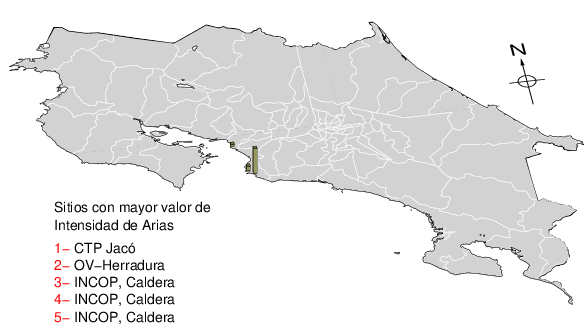 El terremoto de Sámara del 05 de setiembre del 2012 alcanzó un valor de 1207.0 cm/s en la estación de Nosara (GNSR) muy cerca del epicentro. El terremoto de Piedras Negras, que causó graves daños a la ciudad de Alajuela el 22 de diciembre de 1990, alcanzó un valor de 174 cm/s en una estación ubicada en el centro de la ciudad.