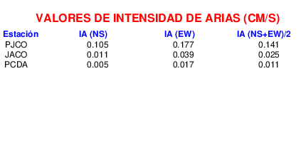 En esta sección se muestra el cáculo de la IA para la componente norte-sur (NS) y este-oeste (EW) de los registros de aceleración que tuvieron valores superiores a los 5 cm/s2, así como el valor total de esta que corresponde al promedio de ambas componentes horizontales.