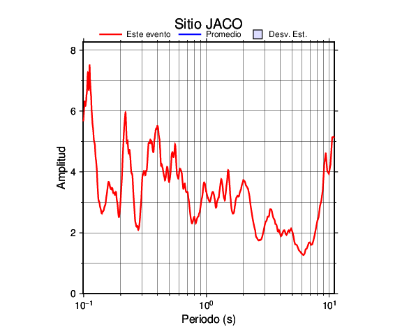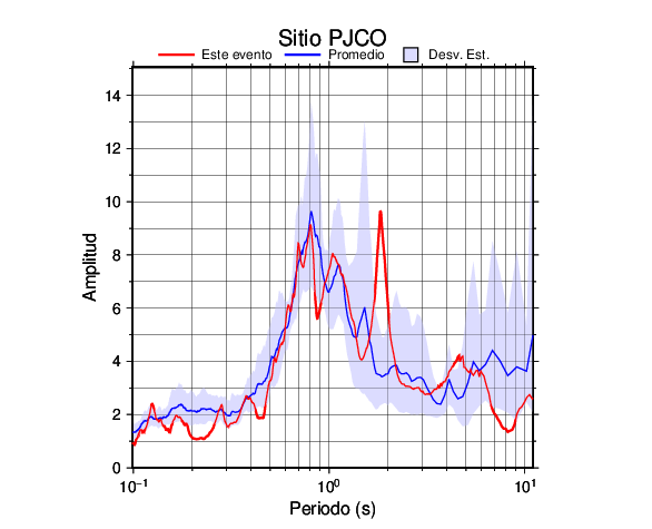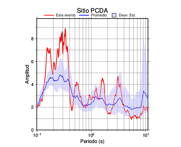 Los resultados que se presentan aquí fueron obtenidos luego de dividir las componentes horizontales entre la componente vertical (conocido como técnica H/V). Se grafica tanto el efecto de sitio del sismo registrado como el valor promedio en cada estación y su correspondiente desviación estándar.