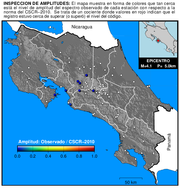 El siguiente mapa muestra de manera resumida qué tan cerca estuvo la amplitud del espectro de respuesta de cada estación de superar el nivel del espectro de diseño del CSCR-2010. El cálculo consiste en comparar periodo a periodo la amplitud del espectro observado con el nivel propuesto por el código en cada sitio para el tipo de suelo y zona sísmica correspondiente.