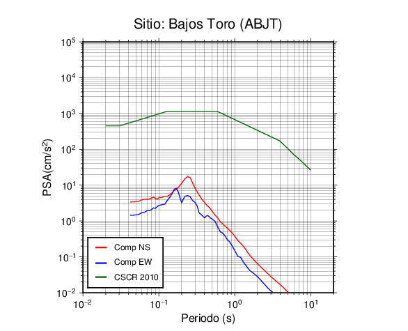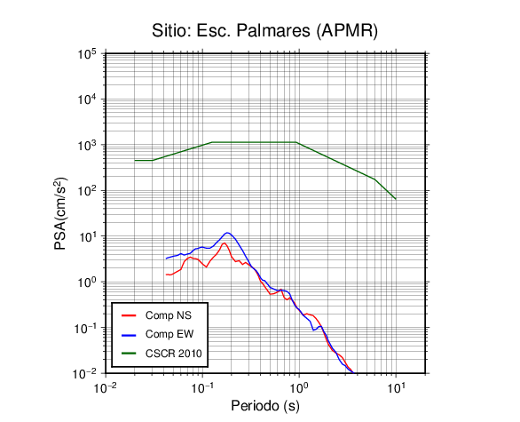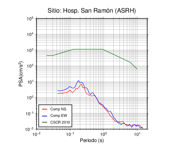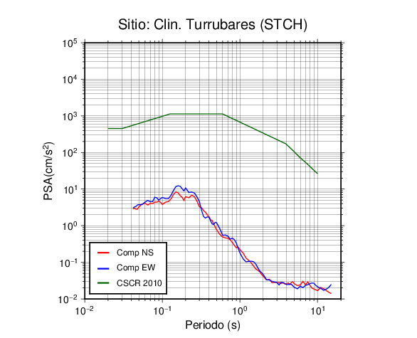 En los siguientes gráficos, la traza verde es el espectro propuesto por el CSCR-2010, la traza roja es el espectro de este sismo en la componente norte-sur (NS) y la traza azul la componente este-oeste (EW). El valor de la amplitud está dado en pseudoaceleración en cm/s2.