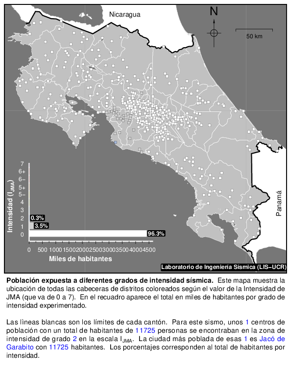 Cada punto sobre el mapa es la cabecera de un distrito. El número de habitantes que hay en cada uno se suma si se encuentra dentro de una misma zona de intensidad sísmica y el total se muestra en el recuadro en manera de porcentajes del total de la población y en miles de habitantes.