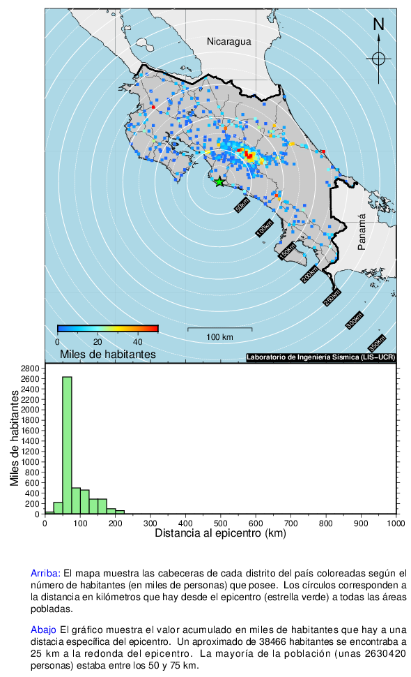 Este mapa muestra la ubicación del epicentro y la cantidad de habitantes que se encontraban a una cierta distancia de este. Los intervalos son de 25 km.