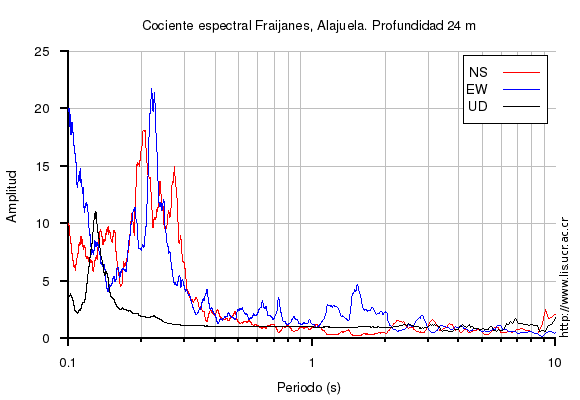 El cociente espectral se obtuvo dividiendo el espectro de amplitud de la componente en superficie con respecto a la componente en profundidad (NS=norte-sur, EW=este-oeste, UD=vertical)